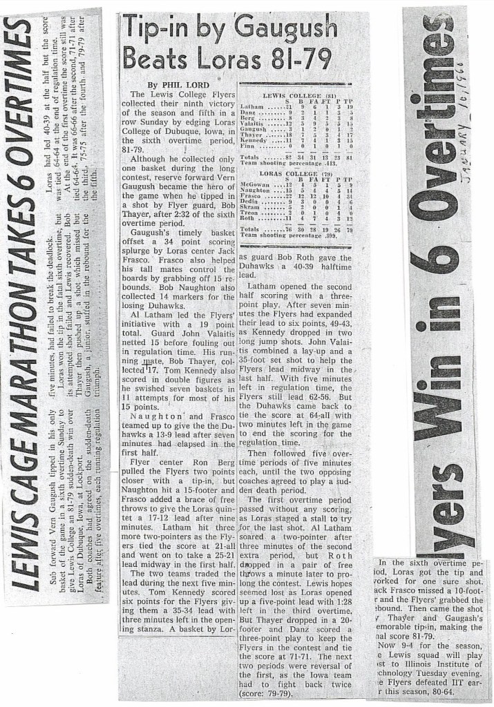 A game played on Sunday, January 10, 1960 is arguably the most memorable game played in Lewis College/University history. The game matched rivals Lewis versus Loras College. It is memorable because the game went into six overtimes and was won in “sudden death.”