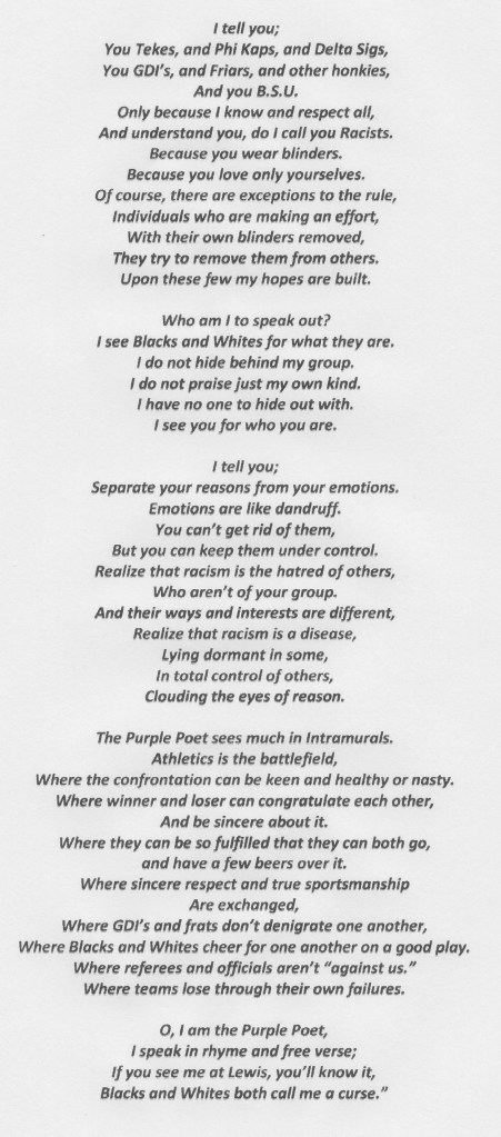 2 thoughts on “The Enigmatic Rhymer of Lewis Intramurals: The Purple Poet