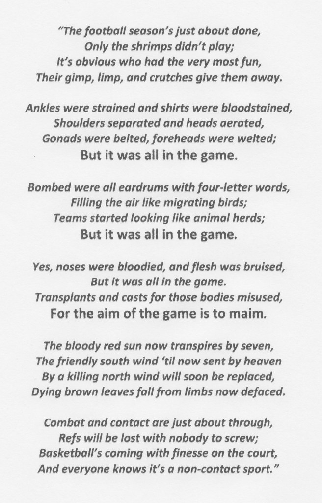 In his later years, the Poet accurately depicted the students’ prominence of the Lewis intramural program in the following verse.