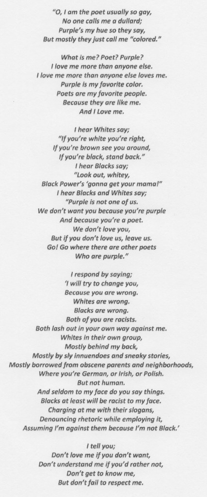 1. The Purple Poet piece that “pointed out in 1969, with disgust, the state of animosity, hatred, and racism among various on-campus groups” is inspired!