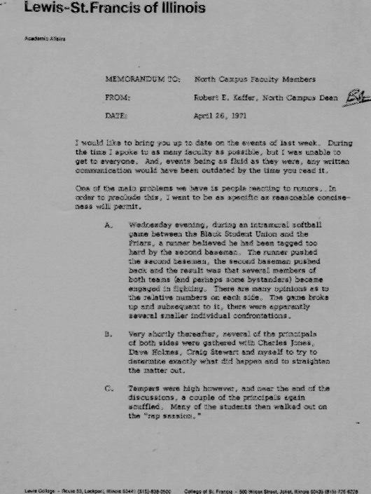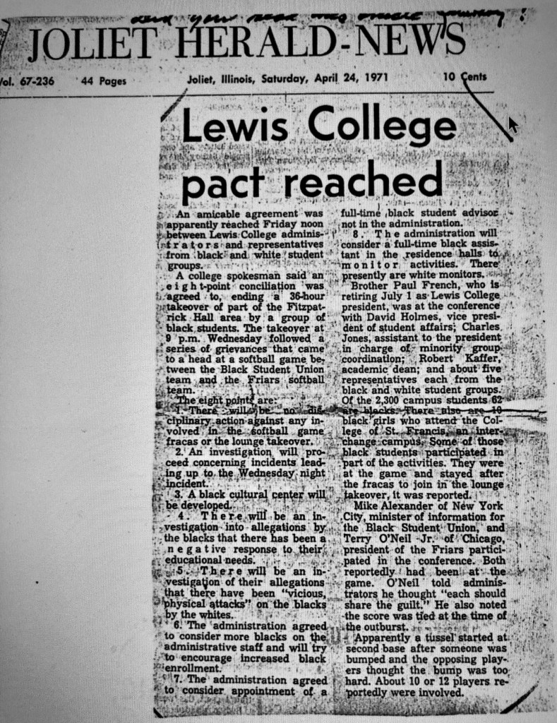 There also were some key student leaders, both black and white, who attempted to resolve critical issues.  When I recently asked them about their involvement, they graciously responded with some written notes but asked that I not identify them.  Their stories were pretty consistent with the documents I retrieved from the Lewis University archives.