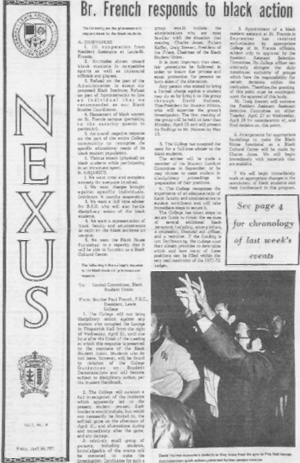 The baseball team played a game at I.I.T in Chicago and we returned to the campus. At 6:00 p.m., a large group of white students gathered in The Catacombs snack bar where the Lewis president, Br. Paul French, attempted to explain the development and present racial situation.