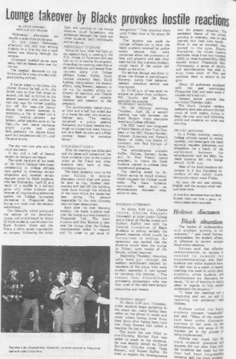Many Black students were increasingly frustrated since coming to Lewis. Their collective view was that the Lewis administration was not addressing their concerns, and this latest incident was the tipping point.  In the evening following the softball game, they expressed their frustration by a “sit in” or a “takeover” of the Fitzpatrick Hall lounge area. That area also included the College switchboard. There they would stay until an agreement was made with the Lewis administration.