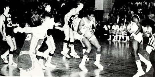 Enough cannot be said about the scoring and rebounding records of Cottrell (6’6”), Sims (6’5”), Stegall (6’4”), Alexander (6’3”), and Wiatr (6’7”).  Syl averaged 20 points and 20 rebounds per game. There were some games when he pulled down over 30 boards and scored over 20 points. He dominated like no other big man. Eugene helped the scoring with 22 points per game.