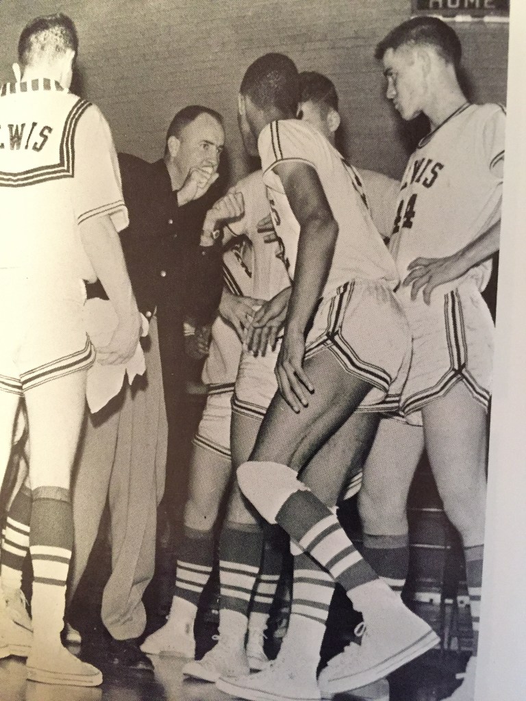 My Joliet baseball friends asked me to join their park district basketball teams in Joliet and Lockport as well as the Lewis intramural league.  Playing in the park districts, however, was especially enjoyable because of the outstanding talent I had the chance to play against.  Young 20-30-year-old former high school players, Black and White, knew how to play a rough, undisciplined brand of ball that was a challenge, but I did pretty well during that fall. Well enough to be invited to be on the Lewis basketball team in January.