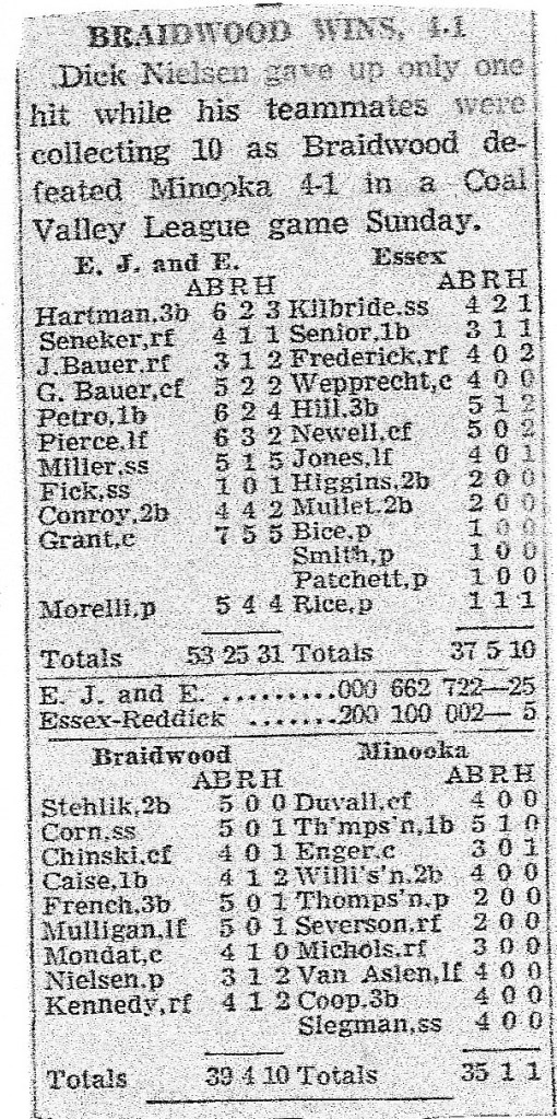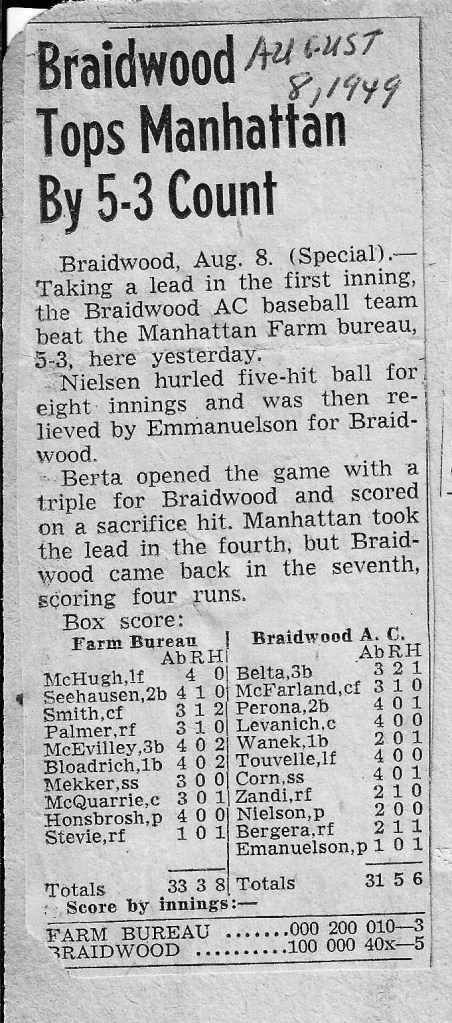 As a player in Joliet and living in Braidwood, the Nielsen team played against the Coal Valley town teams. Town team may now be gone, but they made life more enjoyable in our small towns. And it gave a great start to a young boy’s athletic career.