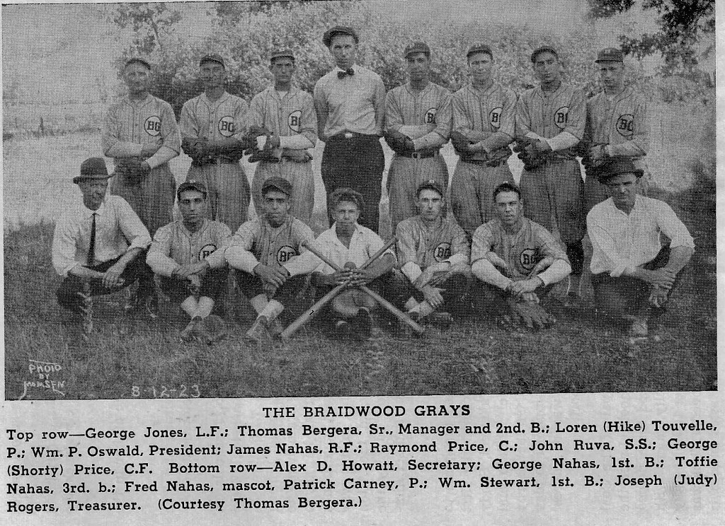 It should be noted that the Braidwood coal mines attracted many fine ball players throughout history. The Grays and the Cubs were outstanding teams in the early 1900s and featured familiar Braidwood names.The Braidwood Cubs were considered one of the most successful semi-pro teams in the midwest. They played between 1902 – 1912. The Grays were a little later, between 1922 – 1926. They were also known as the “Nahas” team as the team was comprised of four Nahas brothers.
