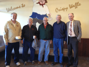 - Have a meal with great friends: We reconstruct hidden nuggets from past adventures, athletic aggrandizement, and gallant glitches. Of course, our conversations are peppered with Gillespie quotes and memories. Left: Pat Sullivan, Ken Nelson, Jim Gassensmith, Paul Ruddy, Tom Kennedy
