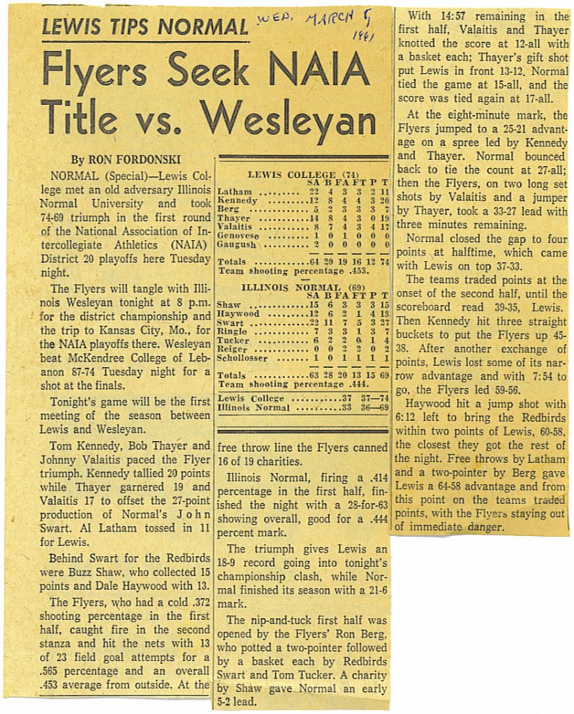 Bob said that his four years at Lewis were similar to his high school years where his team had a mix of black and white players. There were few times that he faced discrimination except for an incident when he was an incoming Lewis freshman. His first roommate assignment was with a white kid from southern Illinois whose parents objected resulting in Bob’s reassignment to a different roomie, Ed Finn who was also a ball player. (After Bob was named MVP that year, those white parents invited Bob to dinner. Bob declined the invitation.)